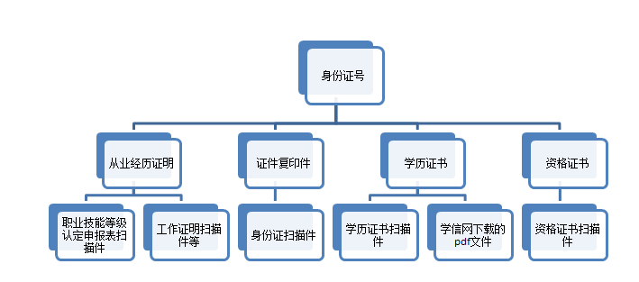 (3)將職業(yè)技能等級認(rèn)定申報表掃描件、工作證明掃描件(圖片大小小于5MB)存放在子文件夾“從業(yè)經(jīng)歷證明”下;學(xué)歷證書掃描件、學(xué)信網(wǎng)下載的pdf文件放在子文件夾“學(xué)歷證書”下;資格證書掃描件放在子文件夾“資格證書”下,身份證掃描件存放在子文件夾“證件復(fù)印件“下,掃描件都是指以jpg格式保存的。