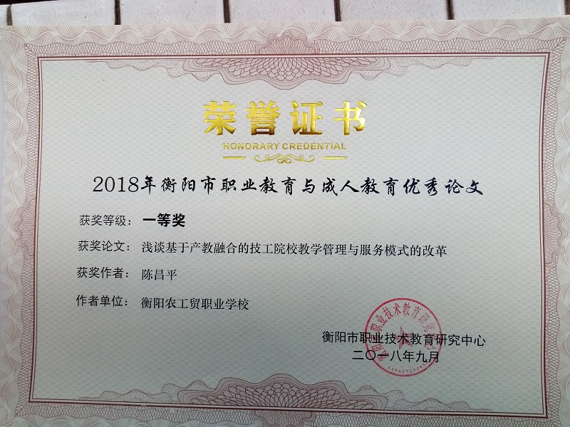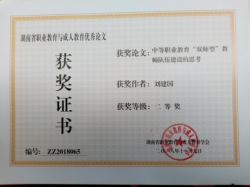 在湖南省2018年度技工教育和職業(yè)培訓優(yōu)秀論文評審中獲一等獎3篇、二等獎3篇、三等獎2篇;在湖南省/衡陽市職業(yè)教育與成人教育論文評審中,獲省級二等獎2篇,三等獎3篇;市級一等獎7篇、二等獎4篇、三等獎10篇;在市經(jīng)濟學會2018年度優(yōu)秀論文評審中獲特等獎1篇、一等獎1篇、二等獎3篇。